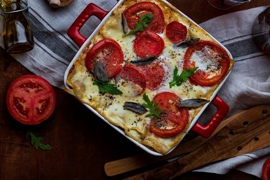 2.מסדרים על תבנית גדולה מרופדת בנייר אפייה את העגבניות, הבטטה והבצל, בוזקים את שמן הזית והמלח הגס וצולים כ-15 דקות, עד שהירקות צרובים היטב. מוציאים ומניחים בצד להתקרר.